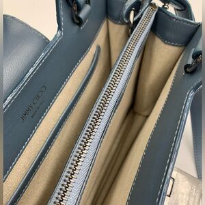 This cool Jimmy Choo 2way tote bag is crafted from a supple suede and raffia in the beautiful dusk blue hue. The compact interior features two compartments and a central zip pocket for storing your important essentials.