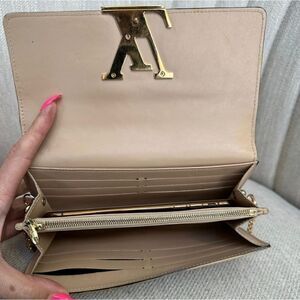 This a preloved *verified* authentic Louis Vuitton LV Logo Beige Leather wallet on chain paired with removable offmarket chain. Auth cert incl. Serial # & logo in pics. Exterior leather dyed and sealed with protectant. All working hardware (buttons, zippers). Other minor imperfections exist (ie scratches. minor tarnish & scratches on hardware. Fits iPhone 14 and14 pro!! Comes with non-LV bag and box. Pet and smoke free home