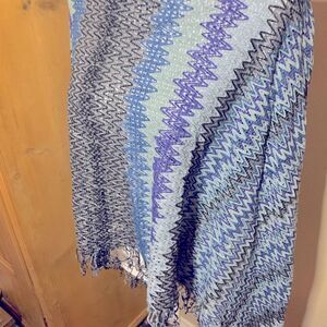 Crocheted in a zig zag pattern in blues, greens and grays, this shawl is perfect for cool summer evenings. Add this playful chic knit over a swimsuit to lounge at the beach or poolside.
