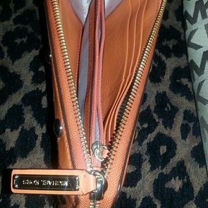 Large MK shoppers bag and wallet with burnt orange look trim. Wallet has zip closure with credit card slots and interior zip for coins. Only carried once.
