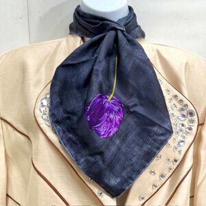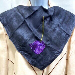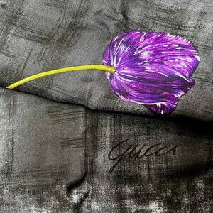 #25) Authentic 100% Silk Gucci Mini Scarf/handkerchief 19" x 19" , satin fabric, gray black purple flower, from Italy,