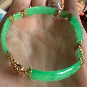 Authentic 14K Yellow Gold Imperial Green Jadeite Jade Link Bracelet 7 " Long