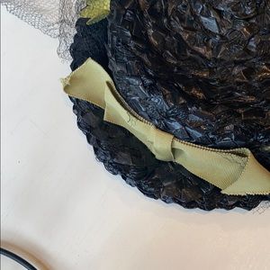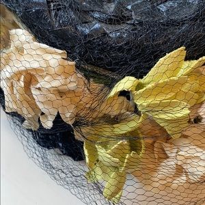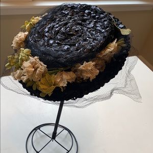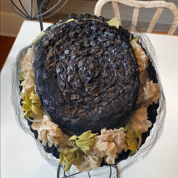 Black straw hat with beautiful flowers and netting