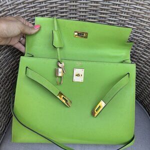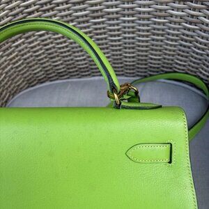 Step into the spotlight with this exceptionally rare Hermès Kelly II Sellier 32, crafted in Vert Cru—one of the brightest and most striking greens ever released by Hermès. This vivid, almost neon shade is a true showstopper and a prized find for any collector who loves a bold, vibrant palette. Vert Cru is an elusive color, making this bag a standout in any luxury wardrobe.
