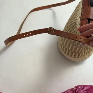Perfect shape on an absolutely stunning bag! Circular bucket design with leather detailing and zip closure. This bag is lined with black polyester. Long and adjustable leather strap! Such a great summer bag!