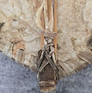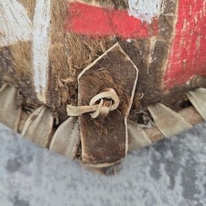 Unique handcrafted tribal shield with red and gold patterns. Perfect for wall decor.