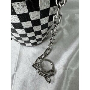 This authentic Alexander Wang Roxy Mini Bucket Bag is crafted in black and metallic silver checkerboard snake-stamped leather and accented with a polished silvertone chain-link key ring. yet bold, the Roxy design features dual top handles with a 5.5 drop, a detachable chunky chain strap, and an open bucket silhouette. Its the perfect mix of edgy street style and practical mini carryall.