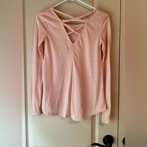 Size XS Chic light pink blouse with long sleeves. Features a stylish cross-back design. Ideal for casual or dressy looks.