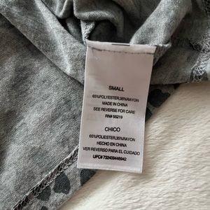 Woman’s cheetah print sleeveless a-line tee. #07 in front in silver. Gray with black spots.