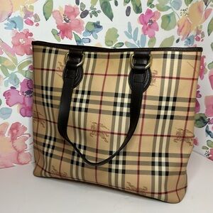 💯Authentic BURBERRY HAYMARKET CHECK TOTE BAG LEATHER HANDBAGS WOMEN🍀