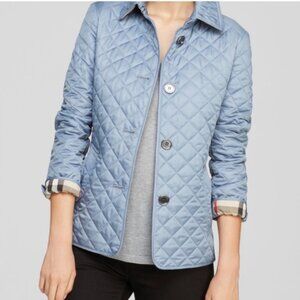 This Burberry quilted jacket exudes timeless elegance with its point collar, button front closure and sophisticated folded cuff. Practical side slip pockets add a functional touch to this versatile essential.