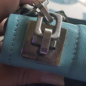Beautiful turquoise-blue, BALLY bag needs someone new to love it! Shows some signs of wear but overall still in beautiful shape. It has a few small marks on it, as shown in the pics, that aren't very noticeable to the naked eye. And the built in mirror is handy to have!! It measures 8 x 7 x 2.5 inches.
