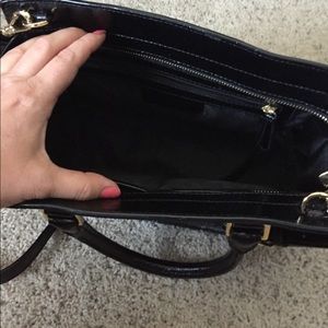 Shiny black. 3 inside pockets. A adjustable over the shoulder strap as well at shorter handles. Looks like NEW.