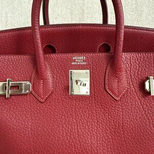 Hermes HAC 32 in rare Framboise color! (Deep raspberry). Featuring palladium plated hardware and Fjord leather. The Haut à courroies (HAC) is Hermès' oldest bag design and the blueprint for the Birkin. When Hermès was still primarily a saddlery, the HAC was designed as a sturdy and practical way to carry saddles and riding boots. This iconic HAC 32cm tote was made by Hermes Paris in 2003 from Fjord leather. Fjord leather is male calf leather known for its fair softness and matte texture. Due to its high water resistance out of all cowhide, this leather is also utilized in casual bags such as the Garden Party. Kept in Excellent condition by a seasoned collector. Date code Square G. Comes with clochette, keys, lock, dustbag and rain protection coat.