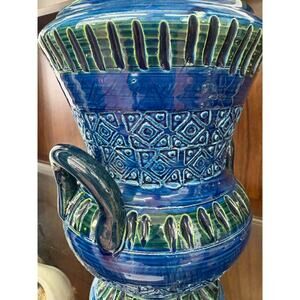 This vibrant Mid-Century Modern Bitossi vase is a striking example of iconic Italian ceramic artistry. Featuring rich cobalt blue and deep green glazes with geometric banding and incised detailing, the urn-like form is enhanced by dual side handles and a pedestal base. Made in Italy, this authentic Bitossi piece captures the bold design and intricate craftsmanship the brand is celebrated for. A standout decorative accent for any collector of MCM ceramics or lovers of Italian design.