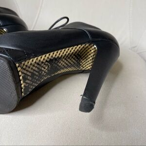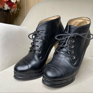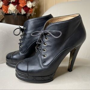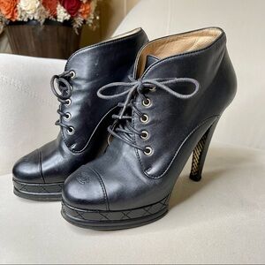 Authentic Black Chanel Booties Shoes Leather Heels Quilted Cap Toe Size 37.5 7.5.