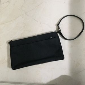 Perfect small handbag for day and night. Measures 10in Width, 5 in Height, and 1 in Depth. Could be worn over the shoulder or as a wristlet. Strap is easily adjustable with a clip on one side.