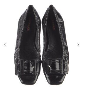 Prada Sport ballet flats crafted in glossy black patent leather with a buckle accent. The scrunch design ensures a comfortable, flexible fit for everyday wear. Prada Sport flats have a comfortable rubber sole that's easy to wear. Prada logo on the heel of the shoe and the toe buckle. These shoes have been worn but as you can see they still have a significant amount of life left in them!