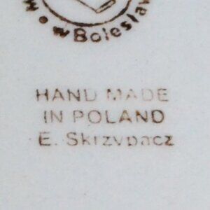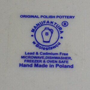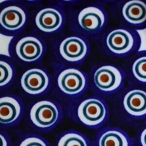 This an authentic Boleslawiec dish in Christmas Tree design with a pattern of peacock eye motif. Shows the artisan's name of E. Śliwińska”.