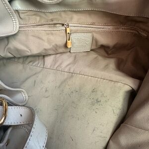 Pre-loved for sure. Authentic. Flaws are all noted in the pics; quite a few flaws. Condition is ok. Dust bag included. Designer bag features brass studs throughout entire outer bag on vinyl. Bag is trimmed with beige leather. Drawstring closure.