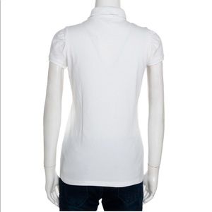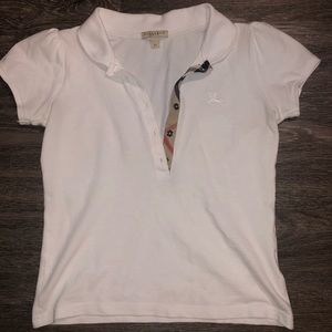 Chic check trims the button placket of this sleek stretch cotton design. Rounded spread collar, puffed short sleeves with thin banded cuffs. Burberry signature Equestrian Knight embroidery on left chest. Great condition with price tag unattached.