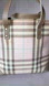 It is PVC Leather and has yellow staining throughout the purse. Has bottom corner wear but inside is clean. Handles still in really good condition. Perfect little handbag for your essentials and more. Please look at all pictures and video. Colors are beige, brown and light pink