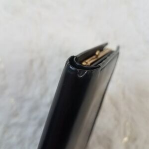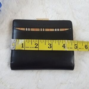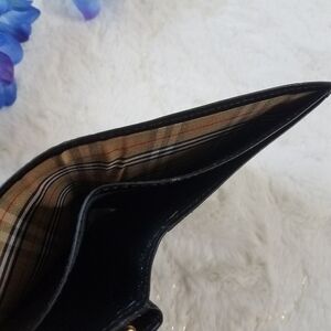 In excellent condition with very minor corner wear if any & minor wear in cash slot! Smooth black leather, clap coin pocket, snap closure, card slots, two cash slots one with nova check print.