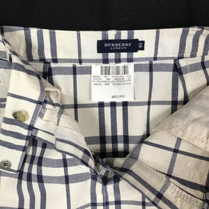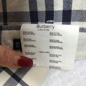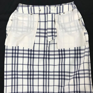 Authentic Burberry Pencil Skirt EU 40 US 4/6 in navy blue and beige colors with check pattern. Excellent condition. Front closure with 5 1/2” zipper with letters YKK engraved and attachment button with Burberry letters well aligned and tab with snap on engraved Burberry one side and Fiocchi Italy on the back. 3 front pockets, embroidered logo on right. Noted one small discoloration on the back at belt level-see last pic, Waist: 14,5”, hips 19,5", Lenght: 22”