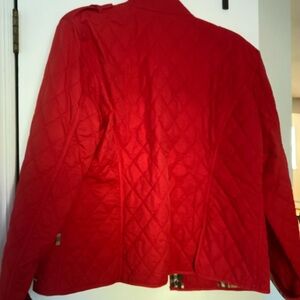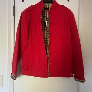 Classic Burberry lightweight jacket with traditional plaid lining; plaid fabric on turn up sleeves; epithet button closure on shoulders; snap and zipper closure; logo on zippers