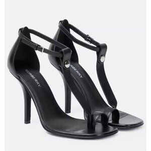 This is an authentic Burberry women's black leather stiletto sandal with an open toe design. The sandals feature a strappy style with an adjustable buckle closure and an ultra-high heel height. They also have a toe-ring detail and are crafted in Italy. The sandals are in US size 7 and are perfect for summer and spring seasons.
