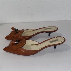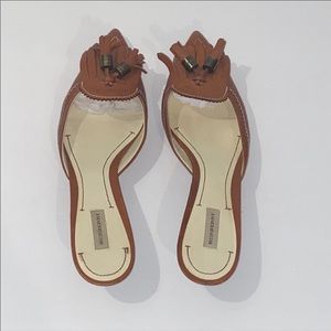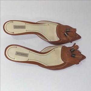 $690 Authentic Burberry leather tassel mules heels sz 9 Euro 39 heels measure 2โ tall good condition light wear light marks slight wear on front bottom tips light wear on bottom heels