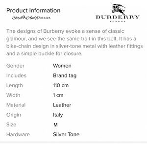 Just in: Authentic Burberry malt brown leather silver tone bicycle chain belt is the perfect accent belt to wear with denim, trousers or over a cardigan. Has original tags detached. There are some scratches on metal & light wear on leather. Overall, VGUC. See photos for details. Size medium. Holes adjust from 32β-36β as shown. Retailed at $820. All purchases over $500, include free Poshmark HQ authentication, inspection and shipping!