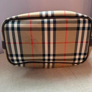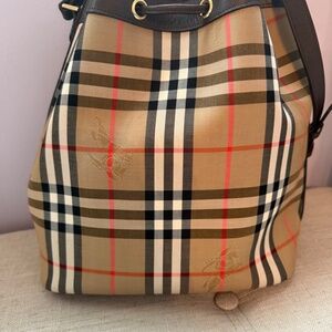 Vintage Burberrys bucket bag. Plastic still on hardware. no smells. Canvas and leather. Bag shape has relaxed. never used.