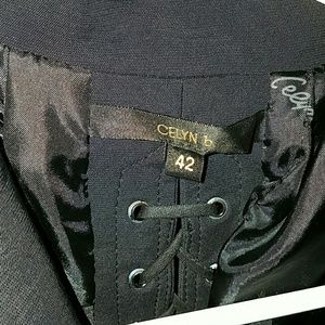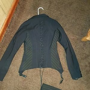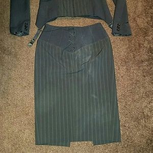 Gorgeous 80% polyamide 15% cotton 5% elastic black n grey pin stripes corset type of ties in the back and on the skirt as well the Blazer and the skirt clothes with hooks like for my bra and the skirt has a slit in the front size 42