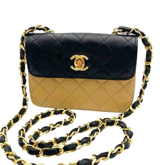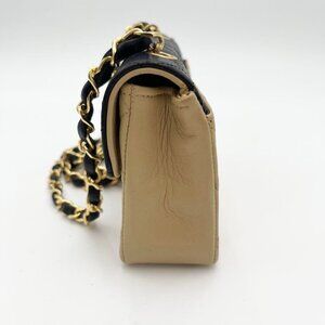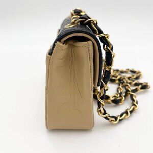 This is an authentic CHANEL Lambskin Leather Quilted Mini Flap Bag in Black and Beige Tan. This stylish crossbody model is crafted of smooth diamond-quilted lambskin leather. The bag features a gold chain leather threaded shoulder strap and a bold gold plated Chanel CC logo for the front flap. 24K Gold Plated Hardware. This opens to a leather interior. This is a timeless bag, ideal for day and evening and just the essentials, from Chanel!