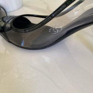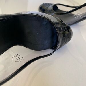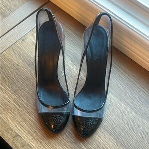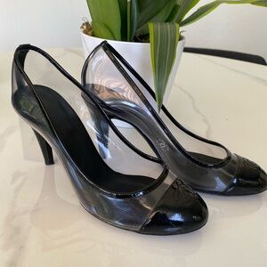 These CHANEL heels boast a sleek patent leather finish and a comfortable elastic slingback strap. The medium-height heel and peep-toe design offer a sophisticated touch, ideal for formal events.