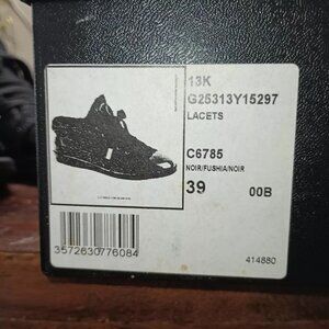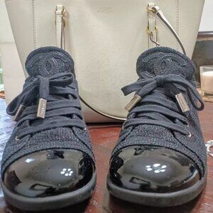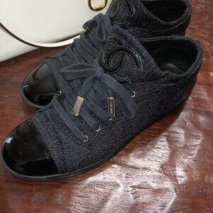 Sneakers are leather inside with tweed and patent leather outer design.
