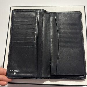 This CHANEL black wallet features a luxurious chevron quilting pattern that adds a distinctive texture to its sleek design. Made from high-quality leather, it has a classic rectangular shape and is adorned with the iconic Chanel double-C emblem.