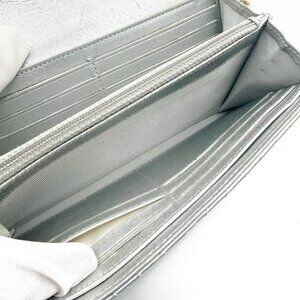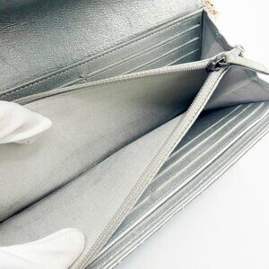 This is an authentic CHANEL CC Chevron V-Stitch Timeless Classic Lambskin Leather Gusset Flap Wallet in Metallic Silver / Gray. This wallet features a silver interlocking CC logo at the front and opens to a matching silver interior with multiple card pockets, open pockets and zipper pockets. Silver hardware. This wallet features a custom added removable insert and chain, turning it into a wonderful daily carry as a shoulder bag, crossbody, or as a clutch. Serial sticker and Chanel Card intact, this is a timeless piece that will only go up in value!