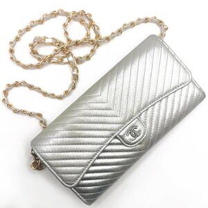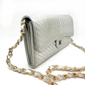 This is an authentic CHANEL CC Chevron V-Stitch Timeless Classic Lambskin Leather Gusset Flap Wallet in Metallic Silver / Gray. This wallet features a silver interlocking CC logo at the front and opens to a matching silver interior with multiple card pockets, open pockets and zipper pockets. Silver hardware. This wallet features a custom added removable insert and chain, turning it into a wonderful daily carry as a shoulder bag, crossbody, or as a clutch. Serial sticker and Chanel Card intact, this is a timeless piece that will only go up in value! Width: 7.5" Height: 4.6" Depth: 1.2" Shoulder Drop: 24" Condition: Excellent vintage. Slight signs of wear present, minor rubs, hairline scratches. Please refer to all photos as they are part of the description. FULL INCLUSION: Chanel Card, Box, Added Insert/Chain 📦 We Ship Daily 💎 100% Positive Feedback ❣️ Follow Us For Latest Designer Arrivals ⚜️ AUTHENTICITY GUARANTEE: All The Reluxe™ items are carefully selected and authenticated by our team of experts. Our items are stored in climate-controlled warehouses and come from smoke-free/pet-free homes. This item has no offensive odors. Preloved vintage items may smell like their materials/storage. Tags: chanel wallet, chanel bag, chanel crossbody, chanel woc, chanel tote, chanel travel, chanel preloved, vintage, y2k, handbag purse, chanel shoulder bag, chanel gst, chanel shopping tote, chanel shopper tote