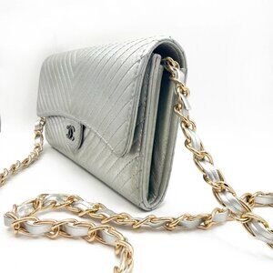 This is an authentic CHANEL CC Chevron V-Stitch Timeless Classic Lambskin Leather Gusset Flap Wallet in Metallic Silver / Gray. This wallet features a silver interlocking CC logo at the front and opens to a matching silver interior with multiple card pockets, open pockets and zipper pockets. Silver hardware. This wallet features a custom added removable insert and chain, turning it into a wonderful daily carry as a shoulder bag, crossbody, or as a clutch. Serial sticker and Chanel Card intact, this is a timeless piece that will only go up in value!