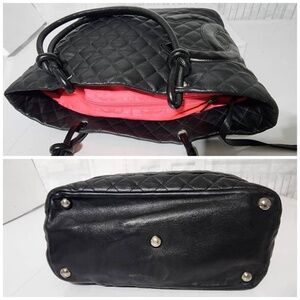 This authentic CHANEL Calfskin Quilted Large Cambon Tote Bag Black is in its pre-owned condition. The exterior is clean. There are little interior shows sign of stain, the made in Italy tag in the interior lining fell off after the thread loosened but the code is intact. It comes with a certificate of authenticity. The bag comes with a matching wallet. Interior shows sign of some ink stain. Kindly look at pictures above for all details.