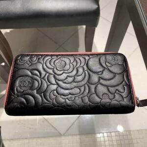 Authentic CHANEL Camellia Lamb Skin Long Zippy Wallet Black Pink