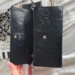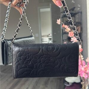 Authentic CHANEL Lambskin Camellia Embossed Wallet On Chain Crossbody Bag