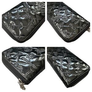 RARE Authentic CHANEL Precious Symbols Black Patent Quilted Lucky Charms Embossed Mademoiselle Biarritz Lambskin Leather Large Zippy Carryall Wallet with Gray Silver Satin Interior Lining