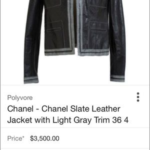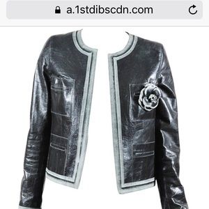 Classic CHANEL BLUE calfskin jacket with blue camellia print/CC logo silk lining. 4 front slit pockets with faded blue trim. Size FR 34. Same jacket in charcoal just sold at 1st Dibs for $3500 (see last pic via Polyvore). Very good condition, worn leather. Aged to perfection!