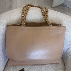 This is an authentic CHANEL CC Tote in Beige. This sleek tote is crafted of smooth beige calf skin leather with a Chanel CC logo embossed on the front. The bag features oversized leather threaded gold chain link shoulder straps and the top is open to a spacious leather interior with a zipper pocket. Comes with authenticity seal (partially peeled) and authenticity card. 16” by 12”. Hardware tarnished, leather aging, inside zipper pull is broken.