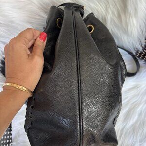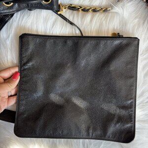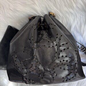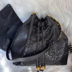 This is an authentic CHANEL Vintage Caviar Perforated Drawstring Hobo. This Chanel has a contemporary appeal with perforated caviar leather and gold hardware, chains and gathered closure- it is certainly a more modern design. The body is larger than most Chanel bags and instead of the CC Chanel logo being stitched, here it is perforated on all corners of the bag. And no flap here, this Chanel closes with a draw string with two brass bulbs at the end yet it does have chain links with a leather shoulder pad. The interior is simply the reverse of the exterior. This is a wonderful bag for any Chanel connoisseur who loves all of the iconic classic Chanel elements in a style that is more contemporary. Comes with a wallet.