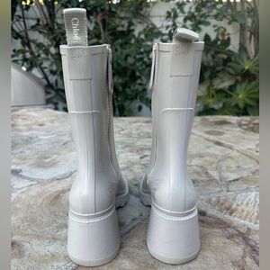 These authentic CHLOE rain boots are in very good condition. There is a scuff on the inside heel of each boot..shown in pictures. The color is Nomad Beige. The size is a 36 which is a 5 1/2 US size but fits a size 6 foot. Comes with dust bags and original box