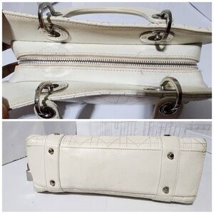This authentic CHRISTIAN DIOR Calfskin Cannage Stitched Small Lady East West Lady Dior Bag Off-White is in its pre-owned condition. The exterior is clean. The edges shows sign of scratch and rubbing wear to it. The zipper pull is missing, a generic zipper pull was attached to it. It comes with a Dior lock. Handles shows sign of rubbing to it. The interior is clean but it shows sign of make up stains to it. Kindly look at pictures above for all details